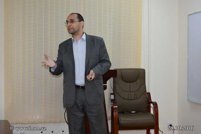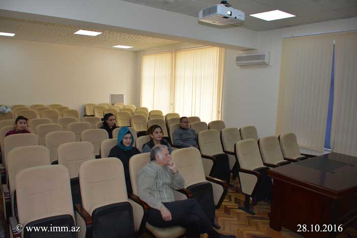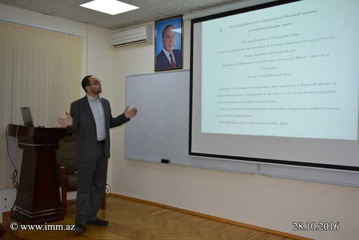 28.10.2016-cı il saat 11:00-da “Riyazi analiz” şöbəsinin “Harmonik analizin müasir problemləri və tətbiqləri” adlı seminarı keçirilmişdir. Seminarda şöbənin aparıcı elmi işçisi, riyaziyyat üzrə elmlər doktoru, dos. Bəndəliyev Rövşən Əlifağa oğlu “Klassik Lebeq fəzasında Hausdorf operatorunun onun məhdudluğu və kompaktlığı” mövzusunda məruzə etmişdir.