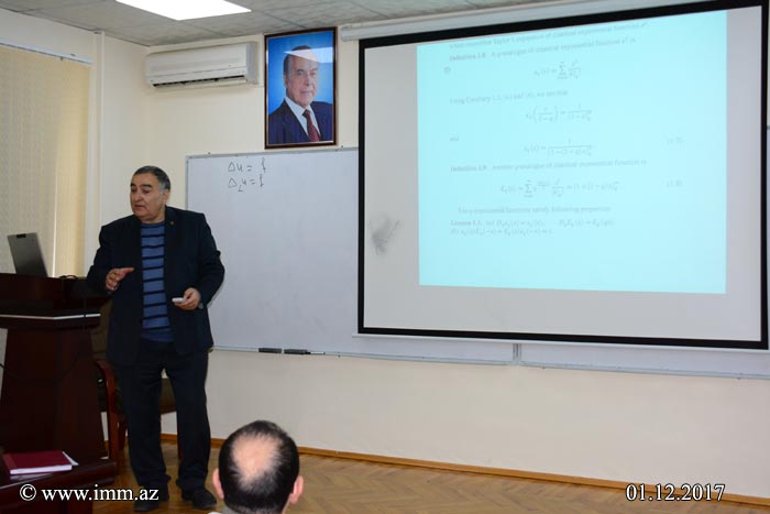 On 01.12.2017, at 11:00 a seminar of “Mathematical Analysis” department “Modern problems of harmonic analysis and applications” was held. At the seminar the head of the department, Corr. member of ANAS Vagif Sabir oglu Guliyev was a talkon “q-Analysisand q-Inteqral Operators”.
