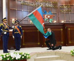 Prezident İlham Əliyev təzim edərək, Azərbaycanın dövlət bayrağını öpdü.