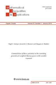 “Dəyişən dərəcəli sıfırlanan ümumiləşmiş çəkili Morri fəzasında Riss potensialının kommutatoru” adlı məqalədə Riss potensialı və onun kommutatorunun dəyişən dərəcəli ümumiləşmiş çəkili Morri və dəyişən dərəcəli sıfırlanan ümumiləşmiş çəkili Morri fəzalarında məhdudluğu üçün kafi şərtləri tapılmışdır.