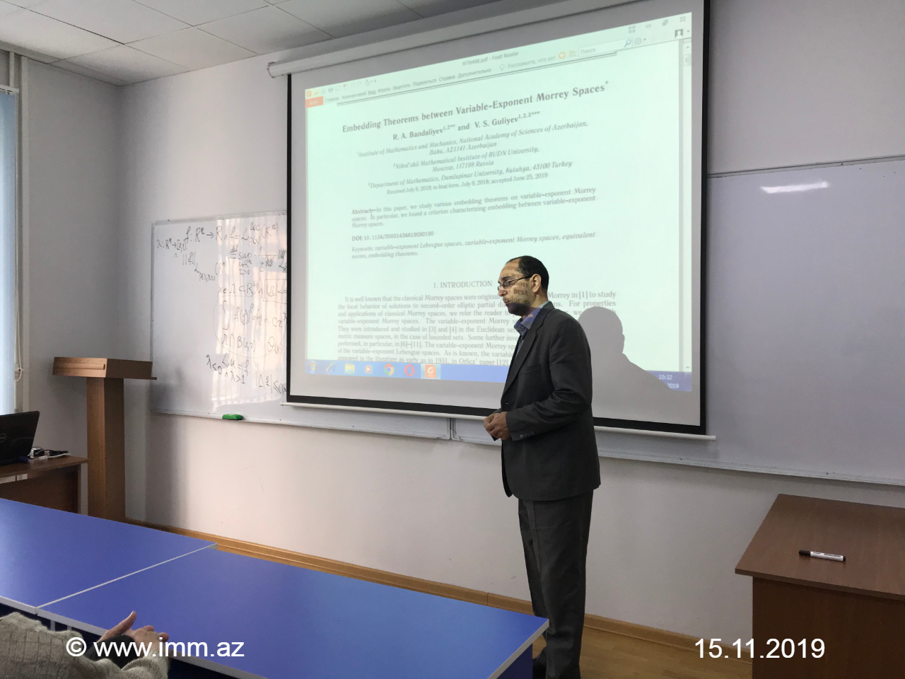 15.11.2019 года в 11:00 состоялся семинар отдела «Математический анализ» под названием “Современные проблемы гармонического анализа и его применение“. На семинаре с докладом на тему «Структурные свойства пространства Морри с переменным показателем» выступил главный научный сот. отдела, д.м.н., проф. НАНА, Ровшан Алифага оглы Бандалиев.
