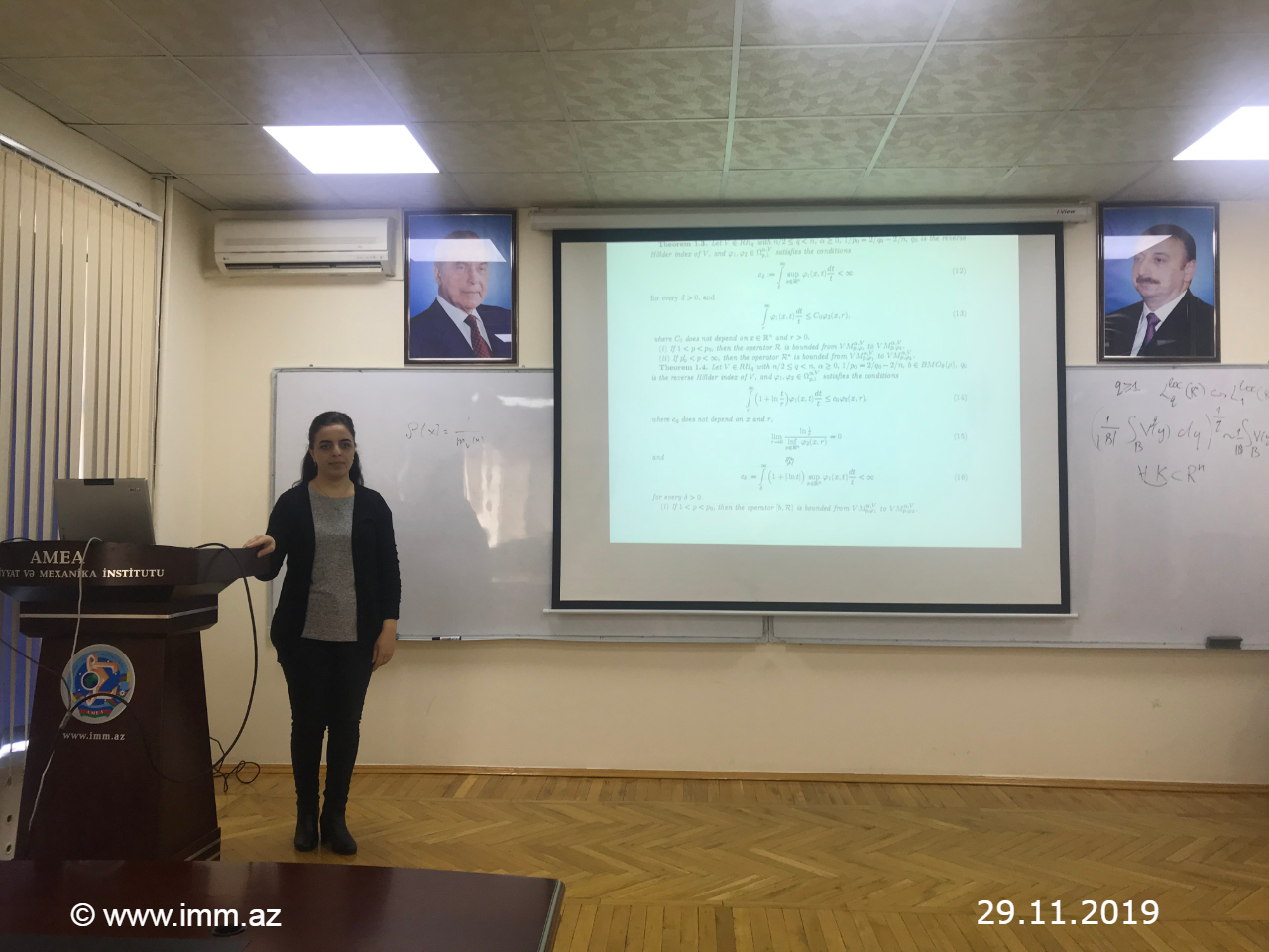 29.11.2019-cu il saat 11:00-da “Riyazi analiz” şöbəsinin “Harmonik analizin müasir problemləri və tətbiqləri” adlı seminarı keçirilib. Seminarda şöbənin böyük elmi işçisi, r.ü.f.d., dos. Ömərova Mehriban Nazım qızı “Şredinger tipli operatorun doğurduğu yüksək tərtib Riss çevirməsinin local ümumiləşmiş Morri fəzalarında məhdudluğu” mövzusunda məruzə edib.