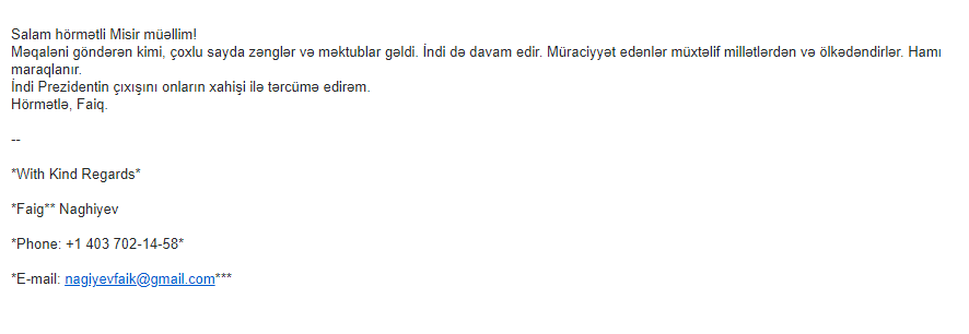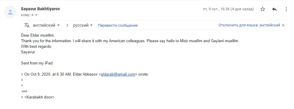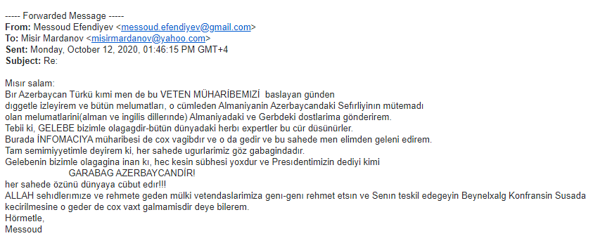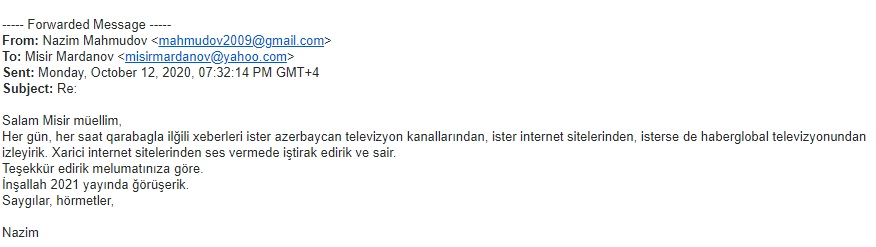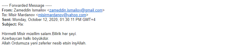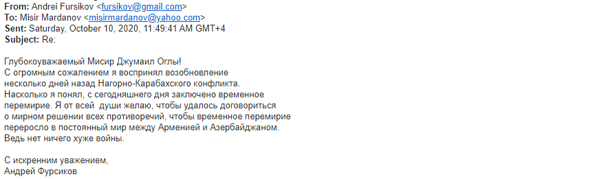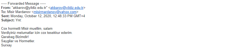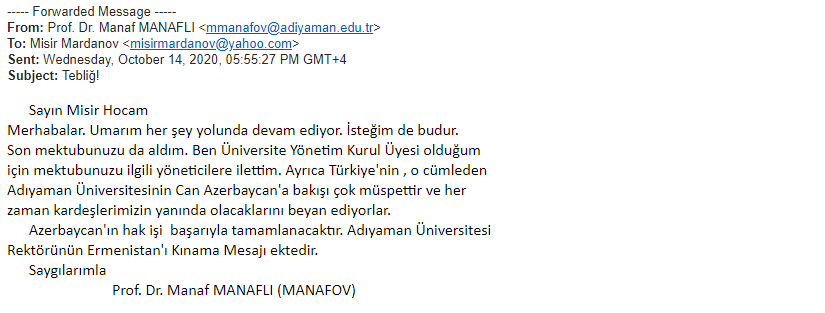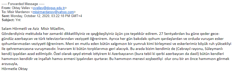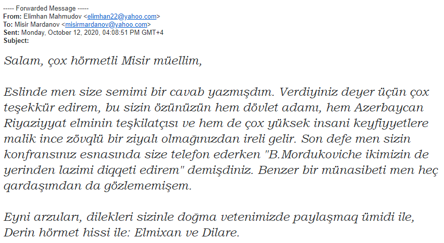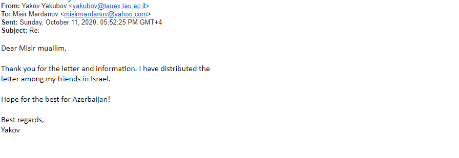 Sentyabr ayının 27-dən etibarən Erməni silahlı qüvvələrinin Azərbaycan ərazisinə, eyni zamanda mülki əhaliyə etdiyi hücumlar haqqında xaricdə yaşayan riyaziyyatçı alimlərə geniş məlumat verilmişdir. Həmin məktublara ABŞ-dan olan Boris Mordukhovich, Türkiyədə yaşayan Elimxan Mahmudov, Rusiyalı alimlər Andrey Fursikov, Elfat Qaleyev, İsraildən olan Yakov Yakubov, ABŞ-da yaşayan Faiq Nağıyev və başqa alimlərdən cavab gəlmişdir. Onlardan bəzilərini xəbərə yerləşdiririk.