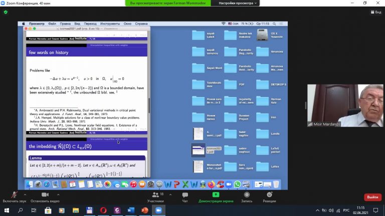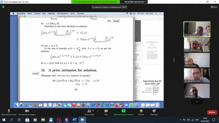 02 İyun 2021-ci il AMEA-nın Riyaziyyat və Mexanika İnstitutunda onlayn formatda keçirilən Ümuminstitut seminarında  Riyazi Fizika Tənliklərişöbəsinin baş elmi işçisi, f.r.e.d., professor Fərman Məmmədov “Bir sinif qeyri-müntəzəm cırlaşmalı elliptik tənliklər üçün müsbət həllin varlıq məsələsi” mövzusunda məruzə etmişdir.