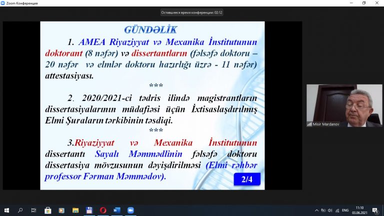 Tədbirdə, AMEA Riyaziyyat və Mexanika İnstitututnun doktorant (8 nəfər) və dissertantların (fəlsəfə doktoru -20 nəfər, elmlər doktoru hazırlığı üzrə 11 nəfər) attestasiyadan keçməsi, 2020/2021-ci tədris ilində magistrantların dissertasiyalarının müdafiəsi üçün İxtisaslaşdırılmış Elmi Şuraların tərkibinin təsdiqi, Riyaziyyat və mexanika İnstitutun dissertantı, Sayalı Məmmədlinin fəlsəfə doktoru dissertasiya mövzusunun dəyişdirilməsi, Mex.ü.f.d. Nigar Nağıyevanın 2002.01 – Deformasiya olunan bərk cism mexanikası ixtisasında dosent elmi adın verilməsi haqqında məsələ müzakirə olunub və təqdirə layiq görünüb. Daha sonra AMEA-nın magistr dissertasiyalarının müdafiəsinin təşkili ilə bağlı məsələlər müzakirə edilib.