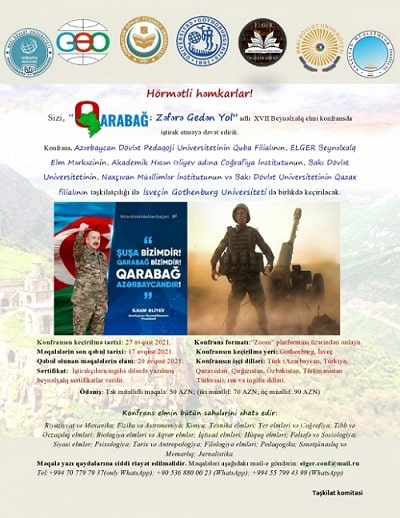 Avqustun 27-də Azərbaycan Dövlət Pedaqoji Universitetinin Quba filialı, “Elger” Beynəlxalq Elm Mərkəzi, AMEA-nın akademik Həsən Əliyev adına Coğrafiya İnstitutu, Bakı Dövlət Universiteti (BDU), Naxçıvan Müəllimlər İnstitutu və BDU-nun Qazax filialının təşkilatçılığı, İsveçin Qotenburq Universiteti ilə birgə “Qarabağ: Zəfərə gedən yol” mövzusunda onlayn XVII beynəlxalq elmi konfrans keçiriləcək.
