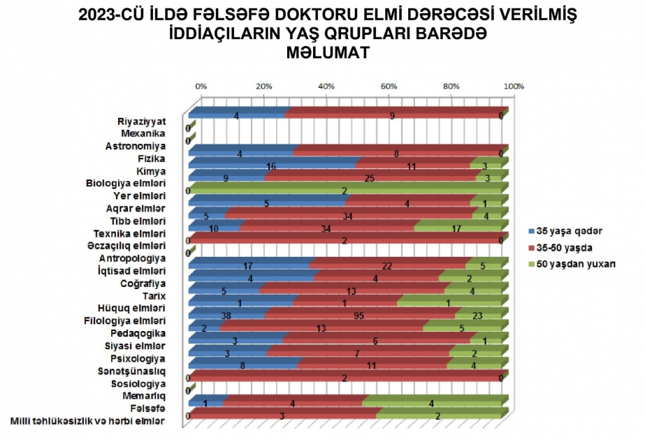 Azərbaycan Respublikasının Prezidenti yanında Ali Attestasiya Komissiyasından bildirilib ki, fəlsəfə doktoru elmi dərəcəsi alanlardan yaşı 35-dək olanlar 135 nəfər, 35-50 yaş arası olanlar 308 nəfər, yaşı 50-dən yuxarı olanlar isə 83 nəfərdir.