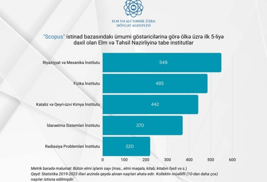 Elm və Ali Təhsil üzrə Dövlət Agentliyi 2019-2023-cü illərdə “Scopus” elmmetrik bazasında indekslənən jurnallarda elmi işləri dərc olunan ilk 5 institutun göstəricilərini açıqlayıb.