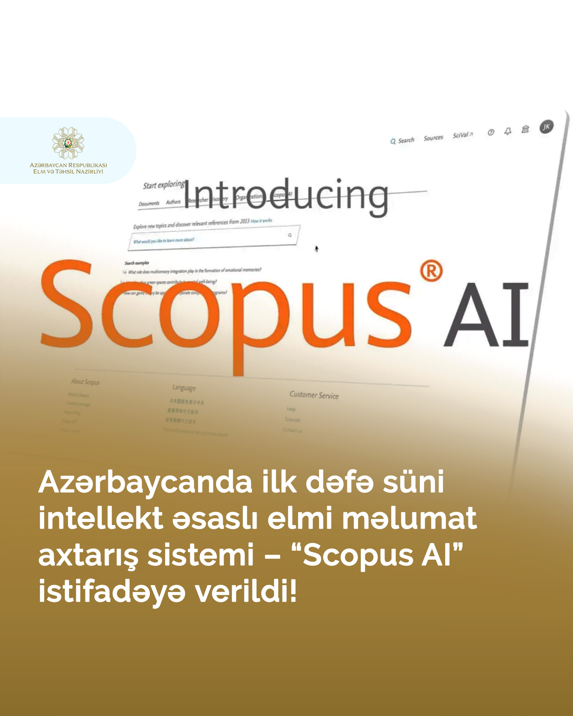 Elm və Təhsil Nazirliyinin təşəbbüsü ilə Azərbaycanda ilk dəfə süni intellekt əsaslı elmi məlumat axtarış sistemi – “Scopus AI” istifadəyə verilib.