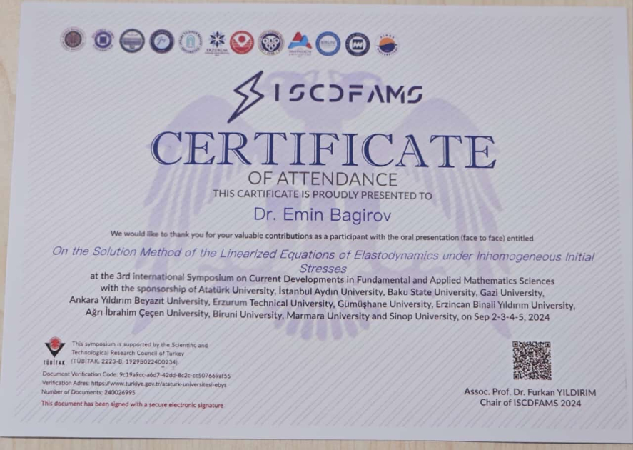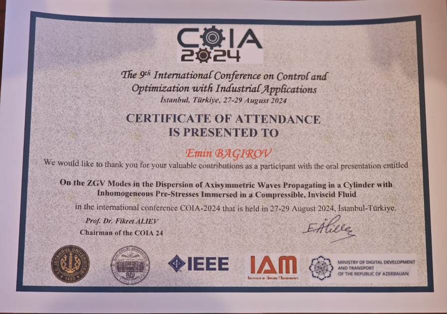 Konfransda, həmçinin E.Bağırovun “Elastodinamikanın xəttiləşdirilmiş tənliklərinin qeyri-bircins ilkin gərilmələr olduğu durumda həll metodu” məruzəsi dinlənilib. Azərbaycanlı alim konfransın təşkilat komitəsi tərəfindən müvafiq sertifikatlarla təltif olunub.
