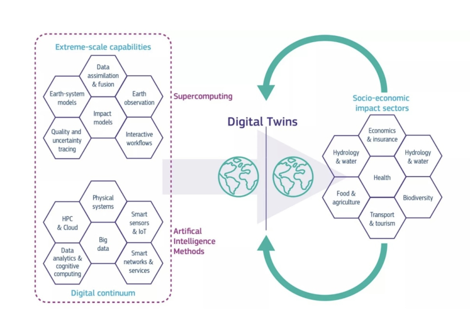 Kompleks kompüter modeli hava və iqlim sistemlərini, eləcə də planetə təsirimizi nəzərə alır. Alimlər ekstremal hava və iqlim dəyişikliyi haqqında etibarlı məlumat əldə etmək üçün Yer planetinin yüksək dəqiqlikli rəqəmsal simulyasiyasını qurublar. Süni intellektlə işləyən bu “rəqəmsal əkiz” su, qida və enerji sistemləri kimi sahələrə təsiri proqnozlaşdırmaq üçün təbii hadisələr və insan fəaliyyətləri arasında qarşılıqlı əlaqəni simulyasiya edir. Keçmişdə iqlim və hava proqnozları ya yerli bölgələrə, ya da daha böyük qlobal sistemlərə diqqət yetirirdi. “Destination Earth” (DestinE) kimi tanınan yeni layihə, “bütün Yer sisteminin mürəkkəb proseslərini təsvir etmək” üçün bütün məlumatları insan hərəkətləri ilə birlikdə bir araya gətirir.