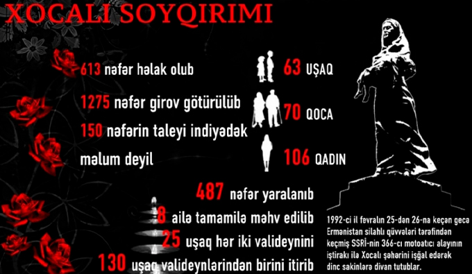 Ermənistanın Azərbaycana qarşı ərazi iddiaları, erməni qəsbkarların xalqımıza qarşı həyata keçirdikləri etnik təmizləmə siyasəti nəticəsində törədilən qanlı cinayətlər, qətliamlar arasında Xocalı soyqırımı xüsusi amansızlığına görə seçilir. Dünya tarixində dinc əhalinin kütləvi qətliamı kimi dərin iz qoymuş Xatın, Lidise, Sonqmi, Ruanda kimi faciələrlə eyni sırada dayanan Xocalı soyqırımı zamanı vaxtilə 7 min nəfərdən çox əhalinin yaşadığı şəhər bir gecədə yerlə-yeksan edildi, qadın, uşaq və qoca demədən günahsız insanlar məhz azərbaycanlı olduqlarına görə qətlə yetirildi.