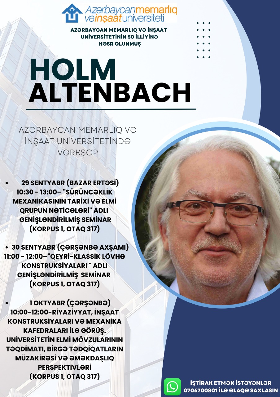 Azərbaycan Memarlıq və İnşaat Universitetinin (AzMİU) 50 illik yubileyinə həsr olunmuş elmi tədbirlər çərçivəsində Almaniyanın Otto-von-Guericke Universitetinin (Magdeburq) professoru, dünya şöhrətli alim Holm Altenbachun iştirakı ilə vörkşop keçiriləcək.